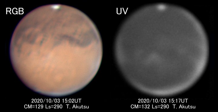| ほぼ同時刻の火星画像。右(UV)画像では地表の模様は写っていない。白く写っているところが雲に相当する。右のリムに沿って朝霧が見られる。北極雲(下)は目立たない。撮像:阿久津富夫氏(茨城県、45p) |
