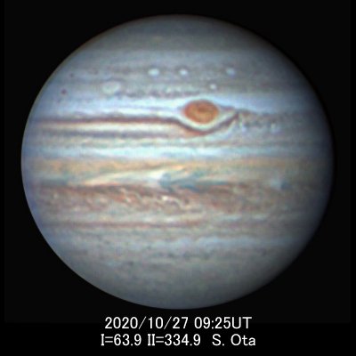 | NTBが濃いベルトとして復活している。BAと大赤斑の間にはSTBの断片が横たわっている。撮像:大田聡氏(沖縄県、30cm) |