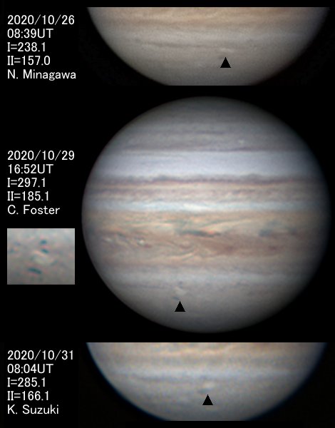 北半球の北北温帯(NNTZ)では、高気圧的白斑(AWO)同士の合体が発生しました。 NN-WS6という長命な白斑とNN-WS7と呼ばれる白斑で、元々40°離れていましたが、8月にNN-WS7が減速し、10月初めには15°に近づいていました。 両者は26日頃に接触状態となり、WS7はWS6の南側から回り込むように動いて、29日のフォスター(Clyde Foster)氏の画像では、WS7がWS6に巻き込まれつつある様子が捉えられています。 31日には大きなひとつの白斑となっていて、合体は完了した様子です。 近年、NNTZではAWO同士の合体がしばしば起こっていて、NN-WS6は昨年11月にも他の白斑との合体が観測されています。