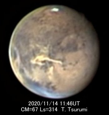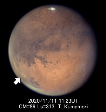 南極冠は非常に小さくなりました。 12月1日現在、経度0°方向から見ると、非常に小さい輝くような光点として見えますが、180°方向から見ると、冬のシーイングでは見えなくなっています。 南極冠が真の南極から偏心しているためです。 このため、南北の向きが分かりにくくなることでしょう。