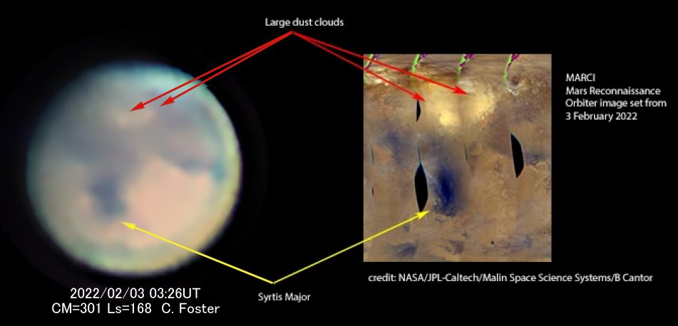 | 上の2本の矢印の先がダストストーム。右はMROの画像(credit: NASA/JPL-Caltech/Malin Space Science Systems/B Cantor)。撮像:クライド・フォスター氏(南アフリカ、35cm) |