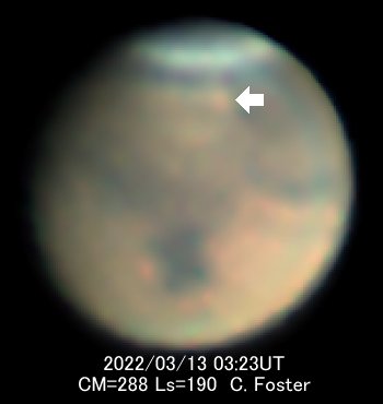 翌日の3月14日にはこの位置からさらに北に拡散しながら進みました。 残念ながら、その後の変化は、観測がなく追跡できませんでした。 極冠はまだ大きいため、エッジダストストームは今後さらに回数が増えると思われます。 極冠のどの経度で発生するかに注意した観測が必要です。
