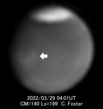 | 矢印で示した明部がダストストーム。中央下の暗部はSyrtis Major。撮像:クライド・フォスター氏(南アフリカ、35p) |