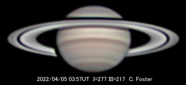 | 環の傾きが小さくなり、土星本体が南北に大きくはみ出して見える。撮像:クライド・フォスター氏(南アフリカ、35cm) |
