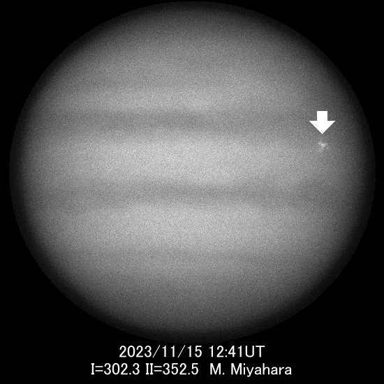 木星11月15日12時41分、またもや木星面で閃光現象が観測されました。 第一報告者は北海道の宮原正育氏で、L画像の撮像中に閃光を捉えたとのことです。 他にも荒川毅氏(奈良県)、鈴木邦彦氏(神奈川県)、井上修氏(大阪府)が撮像に成功しています。 発生位置はI=350°、南緯7°の赤道帯南部(EZs)で、継続時間は報告によってバラつきがあるものの概ね2秒前後だったようです。 動画などで見ると、閃光独特のフレアのような輝線が見られますが、8月の閃光に比べると小規模で、今回も衝突痕は残りませんでした。 閃光現象は2010年以降では11件目で、1年のうちに複数回発生したのは、2021年に続き3回目です。 また、直近は3件連続で日本で観測されています。