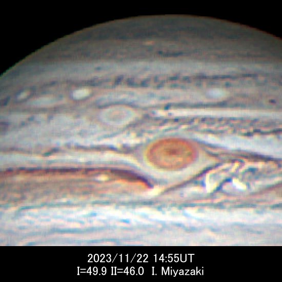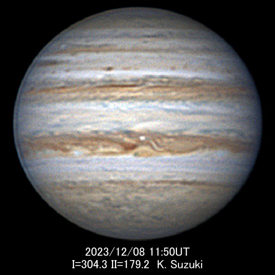 大赤斑(GRS)は相変わらずオレンジ色ですが、周囲を暗部に囲まれて、やや淡く見えています。 近年は縮小傾向に拍車がかかっていますが、今シーズンの平均長径は11.5°と、昨年を下回り、観測史上最小を更新しています。 大赤斑の南側では永続白斑BAが通り抜けて前方に出ました。 9月末からとても不明瞭になっていましたが、周囲の暗い縁取りが復活して見やすくなりました。 以前に比べてひと回り大きくなり、長径は9.8°と大赤斑とほとんど変わりありません。