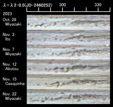 北赤道縞(NEB)では、相変わらず活発なリフト活動が見られます。 先月、NEBの局所的な拡幅域で発達したリフト領域は、前進してII=100°付近に位置します。 この活動で拡幅域は北縁の膨らみがしぼんで通常のベルト幅に戻ってしまいました。 拡幅は解消したと思われましたが、11月13日頃からII=175°にある大きな赤茶色のバージから、北熱帯(NTrZ)にストリークが伸び始め、NEB北縁が活動的になっています。 この領域の活動には引き続き注意が必要です。