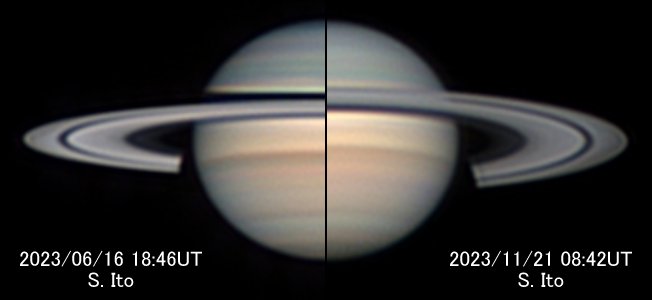 | 西矩の頃(左)に比べると現在(右)は、地球との傾きが増して環が開いた一方、太陽との傾きは減少したせいで暗く見えている。また、土星本体の縞の位置や、本体と環の影の見え方も大きく変化している。撮像:伊藤了史氏(愛知県、30cm) |