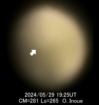 | 矢印の先にローカルダストストームが見られる。撮像;井上修氏(大阪府、28cm) |