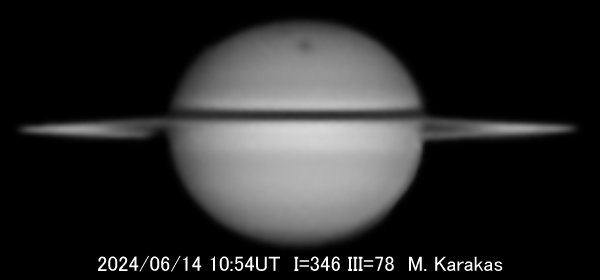 14日にはマイク・カラカス氏(カナダ)らが、衛星ティタンの土星面経過を捉えています。 軌道が真横を向くこの時期ならではの珍しい現象です。 ティタンの直径は5150kmで、木星のガニメデやカリストと同程度ですが、土星は木星よりも小さいので、相対的にとても大きく感じます。 ティタンの公転周期は15日なので、今後も観測のチャンスがあるでしょう。