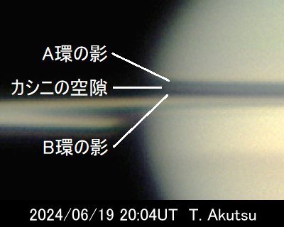環の傾きは6月下旬に1.9°と、今年最小になりました。 画像で見る環は両端が鋭く尖っていて、土星の前面では極めて細く、南側に環の影が幅広く目立っています。 阿久津富夫氏(フィリピン)は、19日の画像で、環の影が一様な黒ではなく、A環に相当する外側がやや淡く、B環の影との間にカシニの空隙を通り抜けた太陽光によって、細い明帯ができている様子を捉えています。
