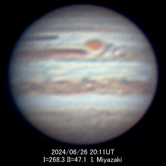 | 大赤斑が明瞭で、周囲の暗部の活動はほとんどなくなっている。撮像:宮崎勲氏(沖縄県、40cm) |