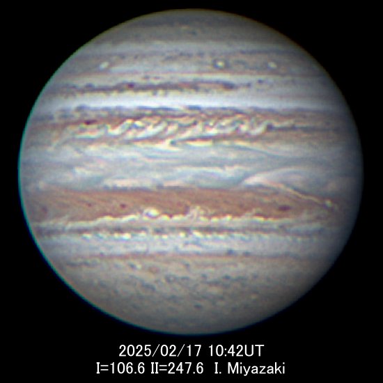 大赤斑(GRS)はII=68°にあり、オレンジ色の本体に変化はありません。 1月後半に後方のSEB南縁にフックが形成され、大赤斑前方に短い南熱帯紐(STrB)が伸長しましたが、活動は弱く、2月下旬には衰えてしまいました。