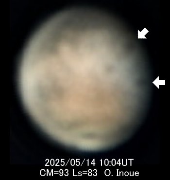 火星面の雲はTharsis(80〜120W, +10)の成層火山周辺が濃く、山頂が雲の穴から見えています。 この雲はLsで120°くらいまで続くので、観測シーズンの終わりまで見られます。 また、Elysium(215W, +30)から西の低緯度でも、淡い白雲帯が300°付近まで見られます。