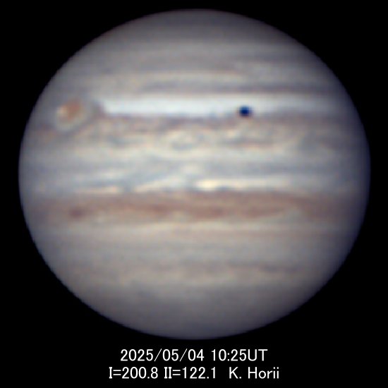 | mid-SEB outbreakが大赤斑に接近、SEB北部が大きく乱れている。大赤斑の上をエウロパ本体が経過中、右はその影。撮像:堀井恵策氏(兵庫県、28cm) |