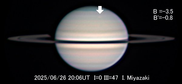 6月26日の宮崎勲氏(沖縄県)の画像では、南緯50°、体系III=66°に白斑が捉えられています(図2)。 高緯度にある淡い2本のベルトの間にあるので、南温帯(STZ)と思われます。 23日にも同じ緯度に白斑が見られます。 同じものかもしれません。