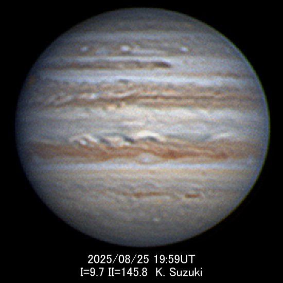 | 左端に大赤斑があり、SEBにはmid-SEB outbreakの白雲が中央付近まで伸びている。撮像:鈴木邦彦氏(神奈川県、19cm) |