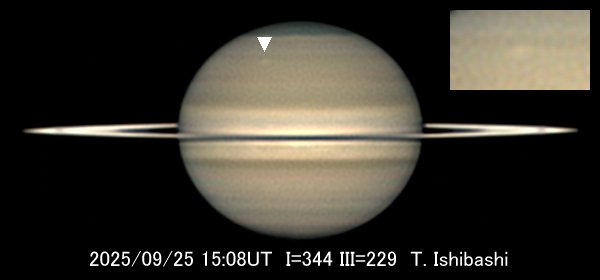 | 衝効果により環は本体よりも明るくなった。矢印(▼)で示したのが南緯43°の白斑。右に白斑を拡大強調した。撮像:石橋力氏(神奈川県、31cm) |