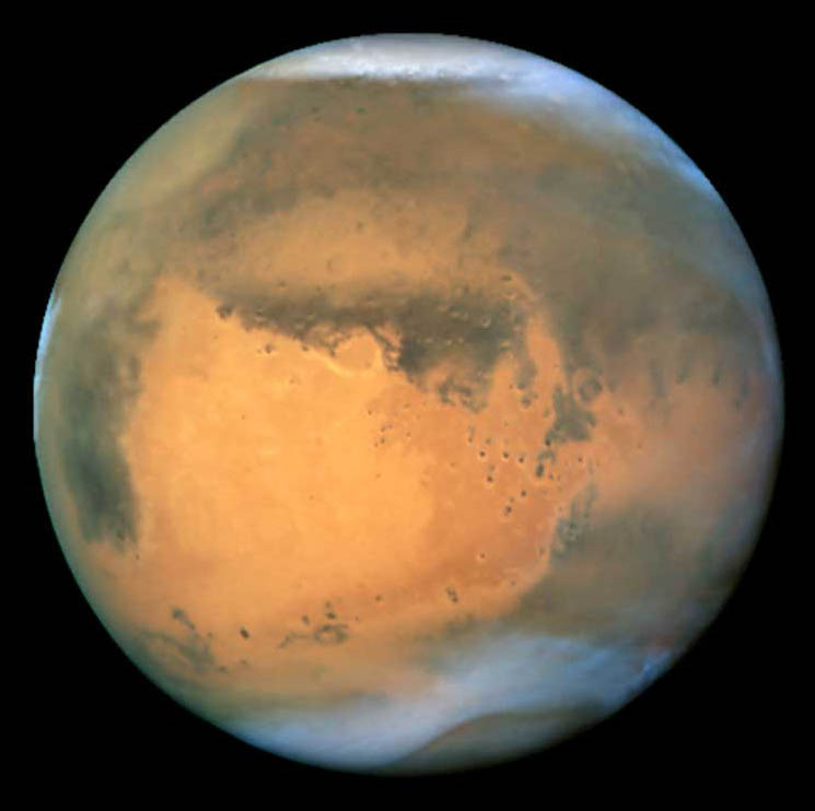 図1 6月26日のハッブル望遠鏡による最接近の火星 左上のヘラスに砂嵐の黄雲が見られる(画像提供:NASA)(画像を拡大) |