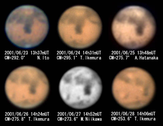 6月22日に最接近を迎えた直後の火星(図1)に、28年ぶりに大黄雲が発生しました。南極冠に集中していた水蒸気が、初夏を迎えて南極冠が縮小するとともに一定の通路を通って北半球に流れていきます。この時、太陽によって熱せられた地面の熱を吸収して急激な上昇気流が起こり、砂塵を巻き上げる台風が発生します。この規模の大きなものが大黄雲と呼ばれ、過去には1956年8月、1971年9月にノア大陸で、1973年10月に太陽湖で観測されました。1971年はアメリカで観測され、あとの2回は日本での観測が中心となりましたが、今回の大黄雲の発生から発達の過程も日本を中心とする限られた地域で観測することができ、本当に幸運でした。