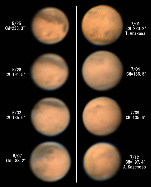 黄雲は火星大気上空まで砂を巻き上げ、地表の模様を覆い隠していきます。図3に1周期前の同じ経度の画像と並べましたが、7月中旬には火星全面が黄雲に覆われてしまい、どの経度を見ているかもわからない状況です。オリンポス山やタルシスの3つの高い火山は、この黄雲の上に突き出しているので、7月9日の画像のように黒い斑点として見ることができます。