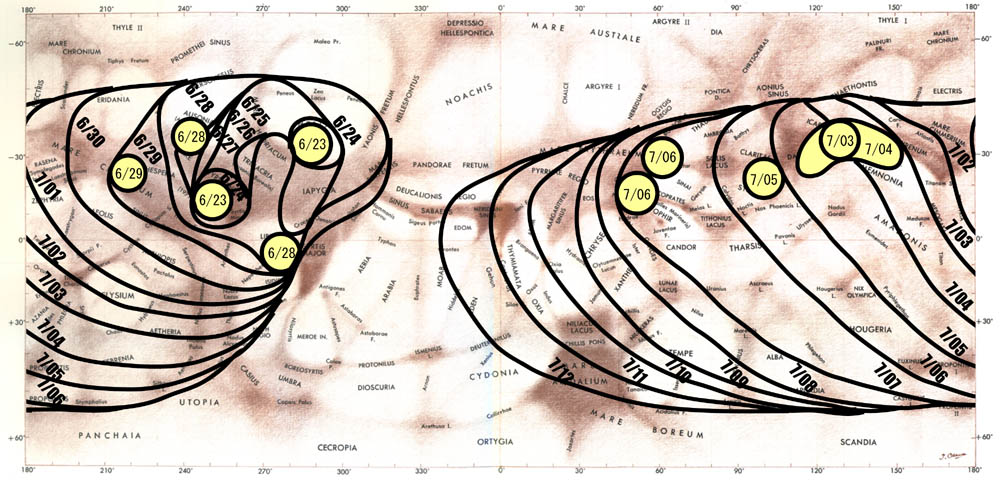 図2のように、今回の大黄雲の発生は6月23日で、チュレニー北部とヘラス北部に明るい黄雲が発生しました。25日にこれらの2つの領域を結ぶように黄雲が発達し、さらに別な黄雲がヘラスから大シルチスへと伸びています。26日にさらに発達した黄雲発生のニュースが全世界を回りました。28日には大シルチスの東のリビヤとアウソニアにも別な明るい黄雲が発生し、黄雲の拡張が一気に始まりました。