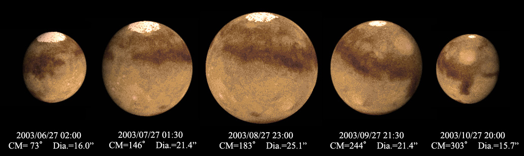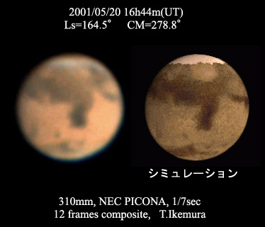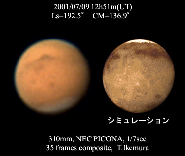 ただ、今年のシミュレ−ションは2001年の観測を元に作成されたもので、2003年のシーズンの観測で更新されたものではありません。火星のシミュレーションのように見えるはずだと言う先入観を持っての観測は絶対にさけ、慎重に見極めるようにして下さい。