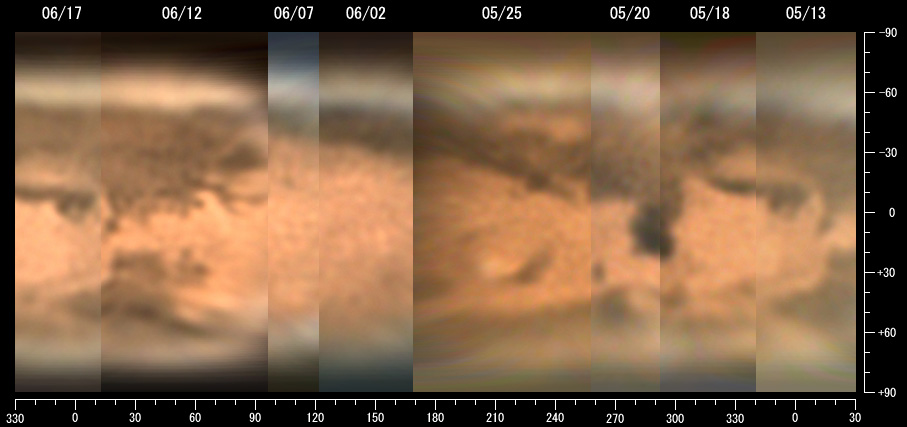 ところがこのヘラスが4月に見えなくなったのです。赤や緑のイメージを調べると、この部分に淡いダストのベールが覆っていることが分かります。