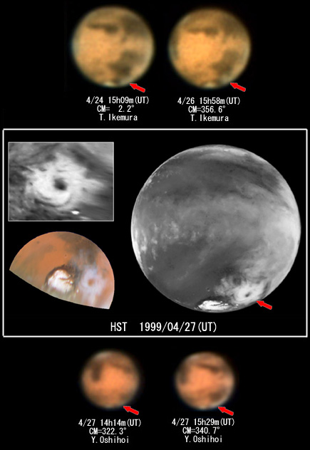 北極地方の巨大台風1999年4月下旬に北極に近いボレウム地方に巨大な台風が出現しました。ハッブル宇宙望遠鏡(HST)が4月27日に青色画像で氷の雲が直径1600kmの渦をまいている様子をとらえました。ちょうどこの経度は日本からのみ観測可能で、4月24日に池村俊彦氏・安達が、4月26日に池村・新川勝仁氏が観測していました。HSTと同じ4月27日には忍穂井幸夫氏をはじめ多くの観測が得られました(図5)。その後の観測はありませんでしたが、火星を周回するマーズ・グローバル・サーベイヤ(MGS)によって、4月30日から5月4日までこの北極を取り巻く定常的な雲の様子が公開されました。 エリシウムの山岳雲もう一つの例として、エリシウムにかかる雲が5月10日の前後で急に晴れて見えるようになった現象の追跡があります。地球の同一地点では火星は毎日少しずつ経度が変わって行きますので、ある特定の地域、この場合はエリシウムだけを追跡しようとすると、日本の観測に引き続いてヨーロッパ、その後アメリカ、そして日本という風に世界の観測者の協力がなければ観測の空白期間ができてしまいます。 図6はこのようにして世界で得られた観測を順次並べてみたもので、エリシウムにかかる雲は池村氏の5月10日の観測までは明るく見えていましたが(第2段)、これ以降は雲が晴れて地肌が見えてきました。日本の観測の後の5月中旬のヨーロッパの観測(第3段)でも、5月下旬のアメリカの観測(第4段)でも、同様に雲が夕方には見えるが朝方の経度では見えなくなっています。6月中旬以降(第5段)はずっとエリシウムに雲がかかる姿は見られませんでした。 このことから、火星の北半球の最盛夏時期に北極冠から溶けた水蒸気が、大循環で運ばれエリシウムの高地で雲として見えていましたが、5月10日頃からは水蒸気の供給が少なくなり雲として見えなくなったようだと考えられます。その後はまだ水蒸気量が増えてくる午後には雲として見えるが、次第にエリシウムの雲が完全に見えなくなっていった様子を知ることができました。 山岳地方には雲がかかる例として、火星の最高峰のオリンポス山にかかる雲を図7に紹介します。中央左の白い丸がオリンポス山で、頂上に雲がかかっています。その左上にはタルシスの3つの火山があり、ここにもしばしば雲がかかることが知られています。 |