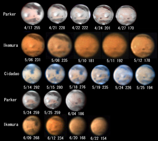 その後、ヘラスの嵐に呼応するかのように、すぐ東にあるツィレッヘナム(西経250°南緯20°)リビヤ(西経275°南緯0°)でも明るい斑点が同時に発生しました。その後、大黄雲は西風に乗って、一気に東へと拡大していきました。また、同時に北半球にも発生し、南北同時に全面を覆うように東へ拡大していき、ついに7月9日には火星全面を覆うようになりました(図9a)。その途中には正体不明の暗い模様が出現したり、明るい斑点が出現したりといろいろな変化を見せました。