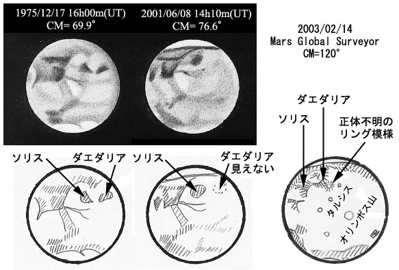 2001年の大黄雲でも、この地域にかなり目立った嵐が起こっていました(図11)。今年の2月14日に撮影されたマーズ・グローバル・サーベイヤーの画像に、この注目すべき場所が写っています(図12)。この画像によると、ダエダリアには1975年にできた時のように新しい模様が出現しています。注目すべきことは、ドーナツ状の暗いリング状の模様です。これが何なのか大いに興味あるものです。