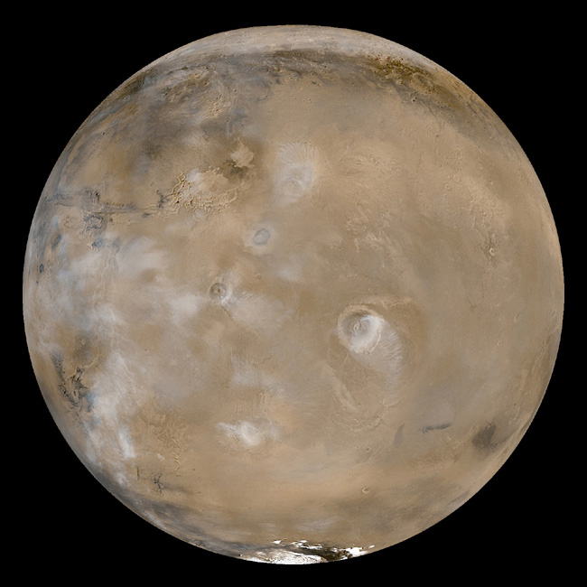 ヘラスは南半球にある円形の大規模な盆地です。内側は全面が砂丘になっており、北に行くほど周囲との高低差が激しく、4000mも差があるところがあります。地肌が見えるとオレンジがかった様子に見えます。周囲が暗い模様になっているところから、白っぽい円形の模様として見えています。また、この盆地全面を覆うような大規模な雲が発生することもよく見られるおもしろい現象です。