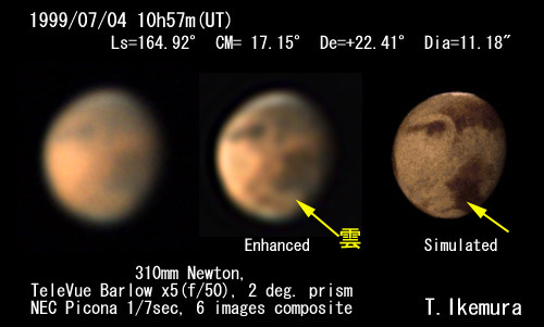 しかし、黄雲はベテランでも見落としやすいほど微妙な見え方をしています。そんな時、重要な助けになるのが火星シミュー ションです。月惑星研究会関西支部の池村俊彦氏の作成したシミュレーションが私達のWEBページにあり、誰でも利用できるようになっています。1999年の火星を例にしてシミュレ−ションと比べてみましょう(図13)。アキダリアの北東部(左下)に明らかな黄雲が発生しているのですが、もしもシミュレーションがなければ判断は難しかったと思われます。