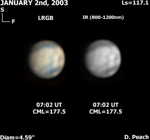 エリシウムは北半球にある大規模な高地です。この高地にはしばしば雲がかかります。原因は一つではありませんが、ほとんどの原因は、高地のため大気の断熱膨張により、雲が発生するのです。2003年1月2日、イギリスのダミアン・ピ−チ氏の撮像した火星(図16)にはエリシウム付近にひょうたん型の雲が写っていました。1999年から急速に拡がったCCDデジタルカメラやビデオカメラによって視直径が小さな時でも注意深く画像処理をすることによって、模様の検出をすることが非常に容易になりました。そのことによって、視直径が非常に小さな時にも火星の状況を良く示す重要な情報を得られることができるようになりました。