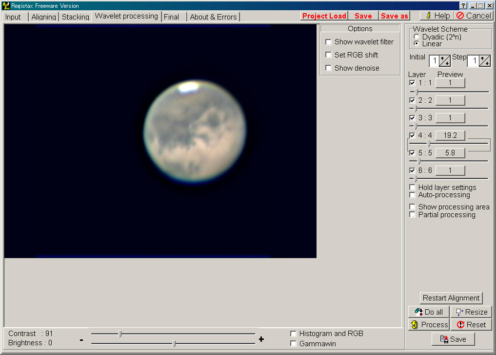 Registaxには動画像を処理する4つの大きな機能があります。まず、ビデオ画像からの良像自動選別によって、1000-2000フレームの画像からシーイングの影響を受けていない良像フレームをランキングします。次に、自動アラインによって、多数の画像を重ね合わせるための位置決めを行います。そして、1000フレームほどの良像だけのスタック(画像のコンポジット処理)を自動で行い、ノイズのない滑らかな画像を作成します。最後に、ウェーブレット変換という独自の画像処理によって、高解像度の惑星画像を得ることができます(図2)。作例に示すように、スタック画像から簡単なスライドバーの操作だけで、惑星の微細な模様が浮かび上がってくることに本当に驚かされます(図3)。また、説明するととても難しそうに見える処理なのですが、これがかなり自動化されていますので、とても少ない操作で結果が得られるという簡便さは大きな魅力になっています。