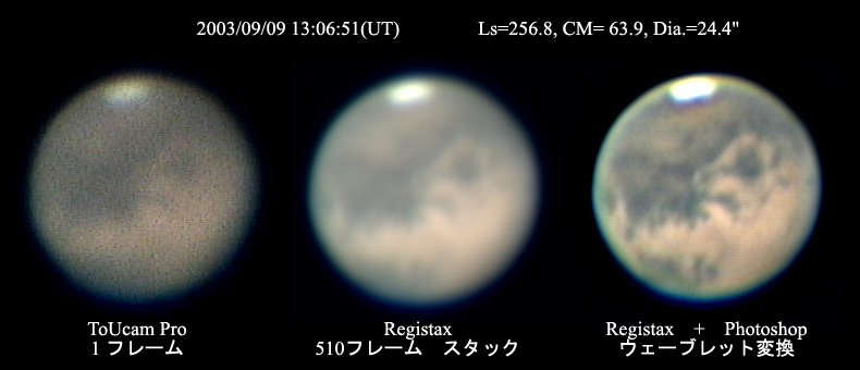図3 ToUcam PROとRegistaxの組み合わせによる作例 28cmシュミットカセグレインによる2003年9月8日の火星。ToUcam PROの1フレームはノイズが多いが、スタックすることで滑らかな画像が得られ、ウェーブレット変換によって高解像度の火星像を得られます。(画像を拡大) |