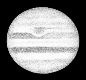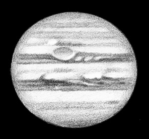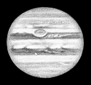 【5cm】 焦点距離が長く、倍率がかけられる良い光学系でないと、模様までの観望はかなり難しい作業です。低くても100倍は欲しいところです。木星本体にベルト(縞模様)が何本か見えます。また、極地方や、ベルトとベルトの間が暗く見えるところもあります。大赤斑は、ベルトのくぼみに淡く見ることができるでしょう。 |