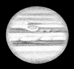 【10cm】 焦点距離の長いものを選びましょう。倍率は150倍は欲しいところです。5cmと比べると光量がありますから、見やすくなるでしょう。主な模様はほとんど見ることができます。衛星の本体が木星面を経過して行く様子や、木星面に映った衛星の影もはっきりと見えるようになります。 |