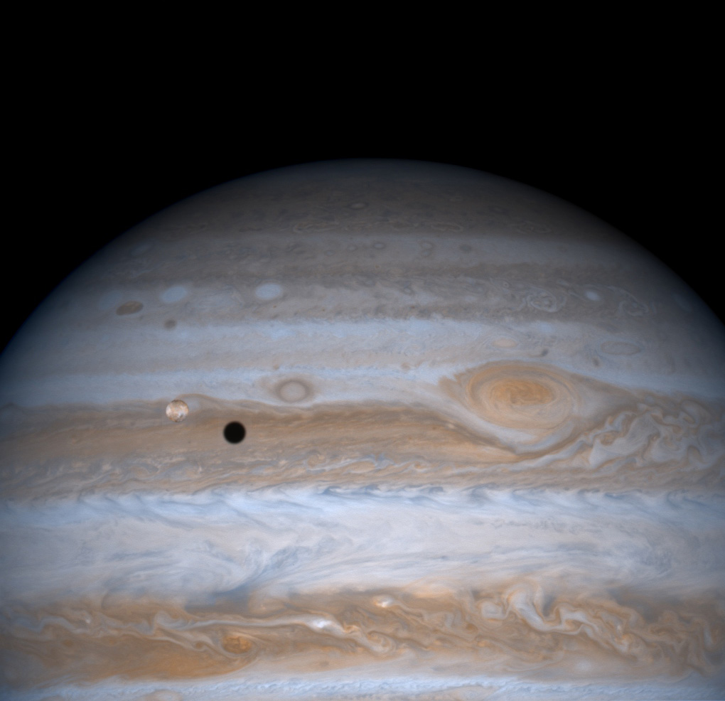 ガリレオ衛星はほぼ木星の赤道面を回っていますので、ちょうど真横から見ていると衛星どうしが重なることがあります。その重なり方にも、衛星が他の衛星の背後に隠れたり(掩蔽)、衛星が他の衛星の影に入ったり(食)します。下の画像は、イオがカリストの背後に隠れる現象をとらえています。このような条件がそろうのは、木星の公転周期11.8年の半分である6年毎のことです。