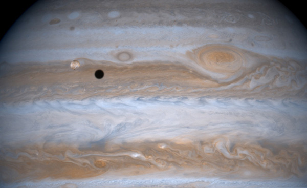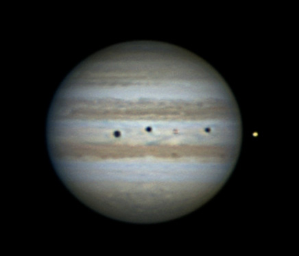 ガリレオ衛星が木星の周りを公転すると、衛星が木星の表面を横切ったり(経過)、背後に隠れたり(掩蔽)、木星の影に入ったり(食)、逆に衛星の影が木星に写ったり(影の経過)、といろいろと楽しむことができます。天文年鑑には、衛星の運行図と合わせて、これらの食現象が掲載されています。下の画像には、イオ、エウロパ、カリストの3個の衛星の影が写っています。同時に2個の影はたまに見ることはありますが、3個同時というのは貴重な現象です。しかも、右側の2個の影の真ん中にはイオ本体の経過も写っています。ところで、この衛星の影の中から見ていると、実は日食が起こっているのです。