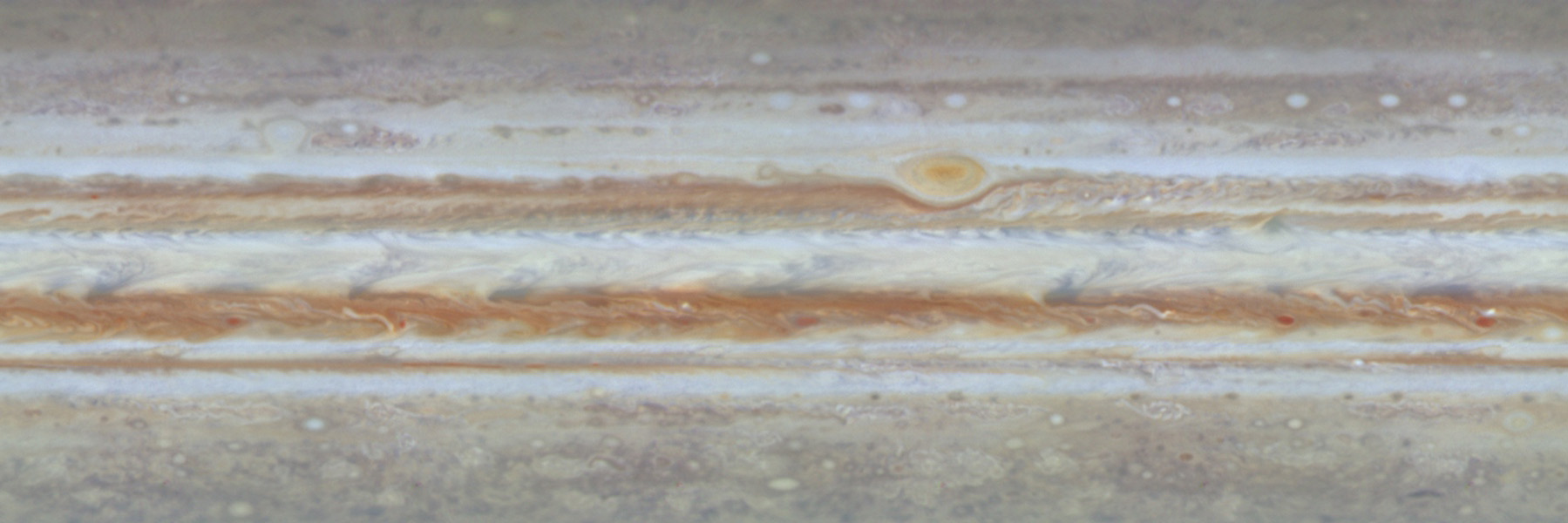 なぜ、木星には赤道に平行な縞模様ができているのでしょうか。木星は巨大でありながら、10時間弱という短い周期で自転をしています。そのために、東西方向だけのジェット気流が大きくなるからです。そして緯度によってその気流の速度差が大きく、境界では乱流や渦が生じて、複雑な模様を見せてくれます。