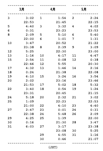 大赤斑は小口径の望遠鏡でも見えやすい模様です。表に示す時間の前後30分以内であれば、大赤斑を見るチャンスです。