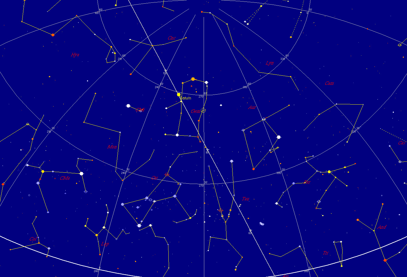 夕方の西空に目を向けると、ふたご座に土星がいます。土星の衝は1月14日でしたが、実はまだ木星よりも高度は高いのです。