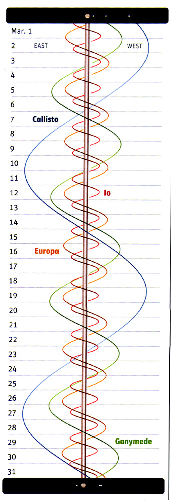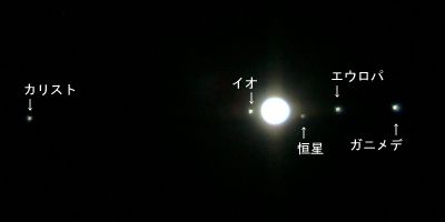 木星には4個の明るい「ガリレオ衛星」があります。これらは1610年にガリレオ・ガリレイが、天体の周りを公転する初めての天体として発見したものです。内側からイオ、エウロパ、ガニメデ、カリストと呼ばれ、大きさは地球の月や水星ぐらいで、明るさは5-6等級です。双眼鏡でも簡単に見ることができますから、ガリレオの気分を体験しましょう(双眼鏡は三脚に固定します)。