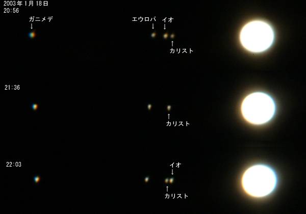 カリストによるイオの掩蔽 2003/01/18 11h56mUT, 12h36mUT, 13h03mUT 米山誠一(横浜市) |