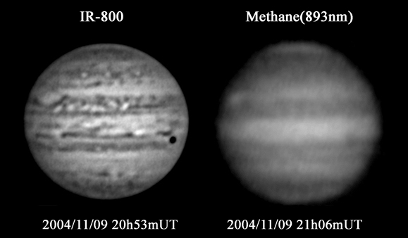 木星や土星などの惑星を観測することは、惑星の大気を見ることになります。きれいなカラー画像だけではなく、大気の特徴を探るために様々な波長で惑星を撮影することをお薦めします。例えば、メタンバンド(893nm)だけを通過する干渉フィルターで木星を撮影すると、大赤斑やSTBの白斑が明るく写ります。これらの模様が、木星大気の高層まで吹き上げている現象であることが理解できます。