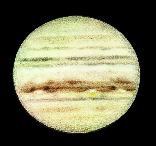 色鉛筆を使ってカラースケッチをするのも、よい記録になります。大赤斑やフェスト?ン(赤道帯にできた青黒い紐のような模様)、赤道縞のオレンジ色など、部分的でも色に気をつけて着色するのは楽しい作業です。