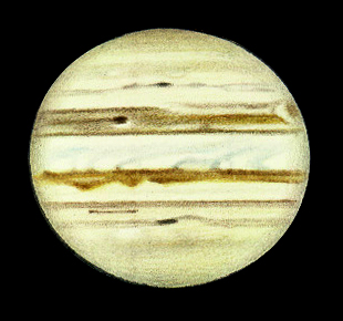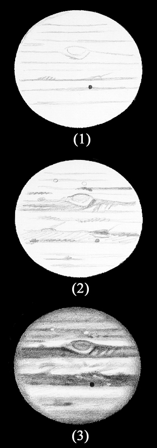 「ゆらめく木星」木星は、視野の中をゆらめきながら日周運動で動いていきます。ゆらゆらとゆらめくのは空気の流れのいたずらです。上空のジェット気流によるものから、望遠鏡周辺の熱源まで原因はいろいろです。なるべく気流の落ち着いた時に観測するようにしたいものですが、ゆらめきのない木星を見るのはなかなか大変です。少しでも熱源のないところを観測場所に選びましょう。 低倍率で木星を視野に導入したら、高倍率に変更します。ピントを合わせて、何が見えているか、ベルトは何本あって、どれくらいの太さか、大赤斑のような模様は見えないかなど、気持ちを落ち着けてしっかり見極めて下さい。 「何枚か描いてみよう」ぼんやり見ていても、様子はつかめません。まずは、一度スケッチ用紙に書き込んでみましょう。いざ描いてみようと思うと、なかなか描けないものです。練習はとても効果があります。気に入ったスケッチや良く撮れた画像をお手本に練習しましょう。非常に早く上達します。