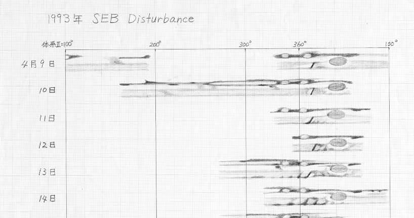 1993年の南赤道縞撹乱の展開図(作成:安達 誠) 大赤斑前方の暗柱から東西に急速に拡大する様子が分かる。(画像を拡大) |