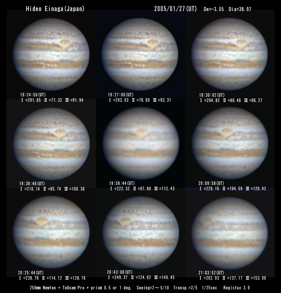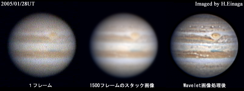 木星を画像として記録するためには、古くはTri-Xを始めとする銀塩フィルムによるコンポジット法や3色合成法などの特殊な技術を駆使して行ってきました。IT時代の今では、デジタル機器を使用して、惑星観測を行うのはそんなに難しいことではありません。使用できる機材は、デジタルカメラ、デジタルビデオカメラ、WEBカメラ、冷却CCDカメラなど、種類も豊富です。得られた惑星画像を、パソコンで処理すると、驚くほど簡単にきれいな画像を手に入れることができます。